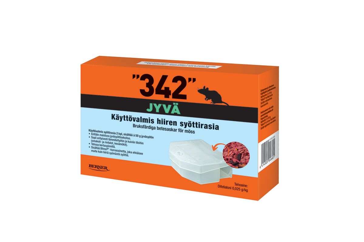 - Hiirten torjuntaan lämmitetyissä tiloissa, kuten omakotitaloissa, rivitaloissa ja kesämökeillä sopii jyväsyötti. Sen tuotenimi on ”342” syöttirasia 2 kpl, à 50g jyväsyötti.