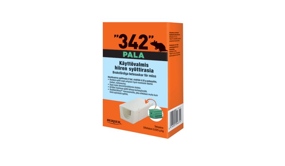 - Hiirten torjunta kosteissa lämmittämättömissä tiloissa, kuten rantasaunat tai kellarit, onnistuu palasyötillä, jonka tuotenimi on ”342” syöttirasia 2 kpl (tai syöttirasia 4 kpl), à 25g palasyötti.