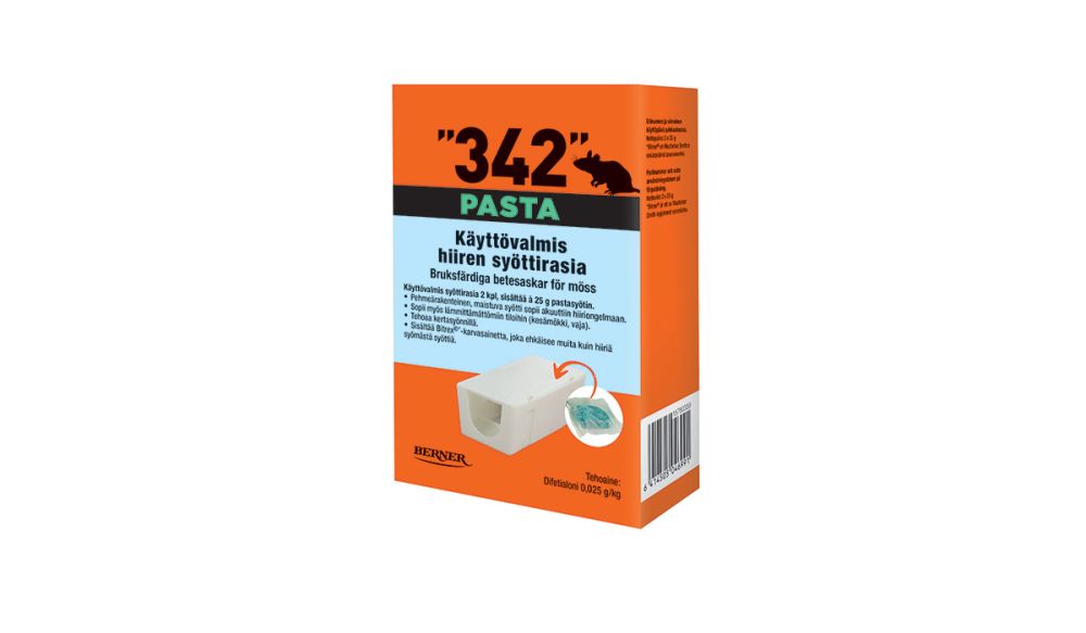 - Hiirten torjuntaan lämmitetyissä tai lämmittämättömissä (kylmissä) sisätiloissa esimerkiksi omakotitaloissa, kesämökeillä ja vajassa sopii erityisen hyvin pasta- eli tahnasyötti ”342” syöttirasia 2 kpl, à 25g pastasyötti.