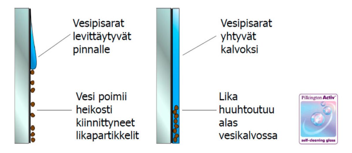 Ikkunoihin on saatavilla myös itsepuhdistuva lasi, jonka toiminta perustuu fotokatalyyttiseen reaktioon lasin pinnalla. Yksinkertaistettuna lasissa on pinnoite, joka pilkkoo orgaanista likaa ja heikentää lian tarttuvuutta. Itsepuhdistuvan lasin toimivuus edellyttää auringonvaloa ja vettä, mutta pinnoitteen toimintaan riittää myös hajavalo. Jos sadevesi ei luonnostaan pääse ikkunaa kastelemaan, riittää kun ikkuna kastellaan silloin tällöin esimerkiksi vesiletkulla. Sama pätee myös pitkinä sateettomina kausina. Itsepuhdistuvalla lasilla varustetut ikkunat ovat suosittuja esimerkiksi toisen kerroksen kiinteissä ikkunoissa, joita ei voi avata pesua varten. Esimerkkinä tällaisesta tuotteesta on Pilkingtonin Activ™.