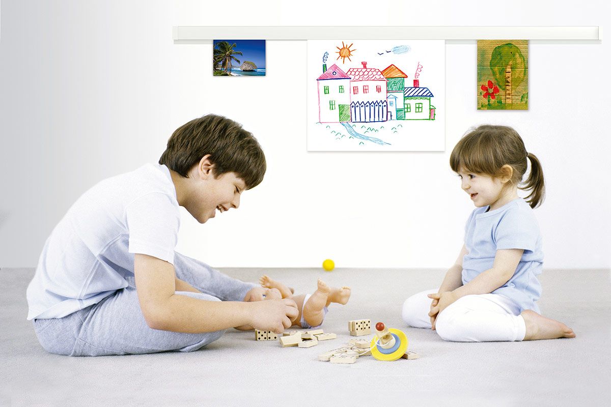 Taulujen paikkoja voi vaihdella kiskossa vain liu´uttamalla sivusuunnassa ja vaijerissa koukkua nostamalla tai laskemalla. Taulujen paikan vaihto tai uusien sommitelmien tekeminen on enää vain mielikuvituksesta kiinni!