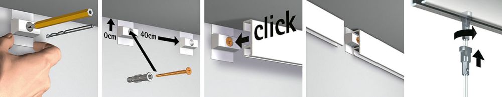Taidegallerioista tutun ripustusjärjestelmän voi toteuttaa kotiinkin aivan edullisesti. Pisla Easy -taulunripustuskiskoja on kaksi mallia: seinään kiinnitettävä seinäkisko tai profiililtaan sirompi kattoon kiinnitettävä kattokisko.