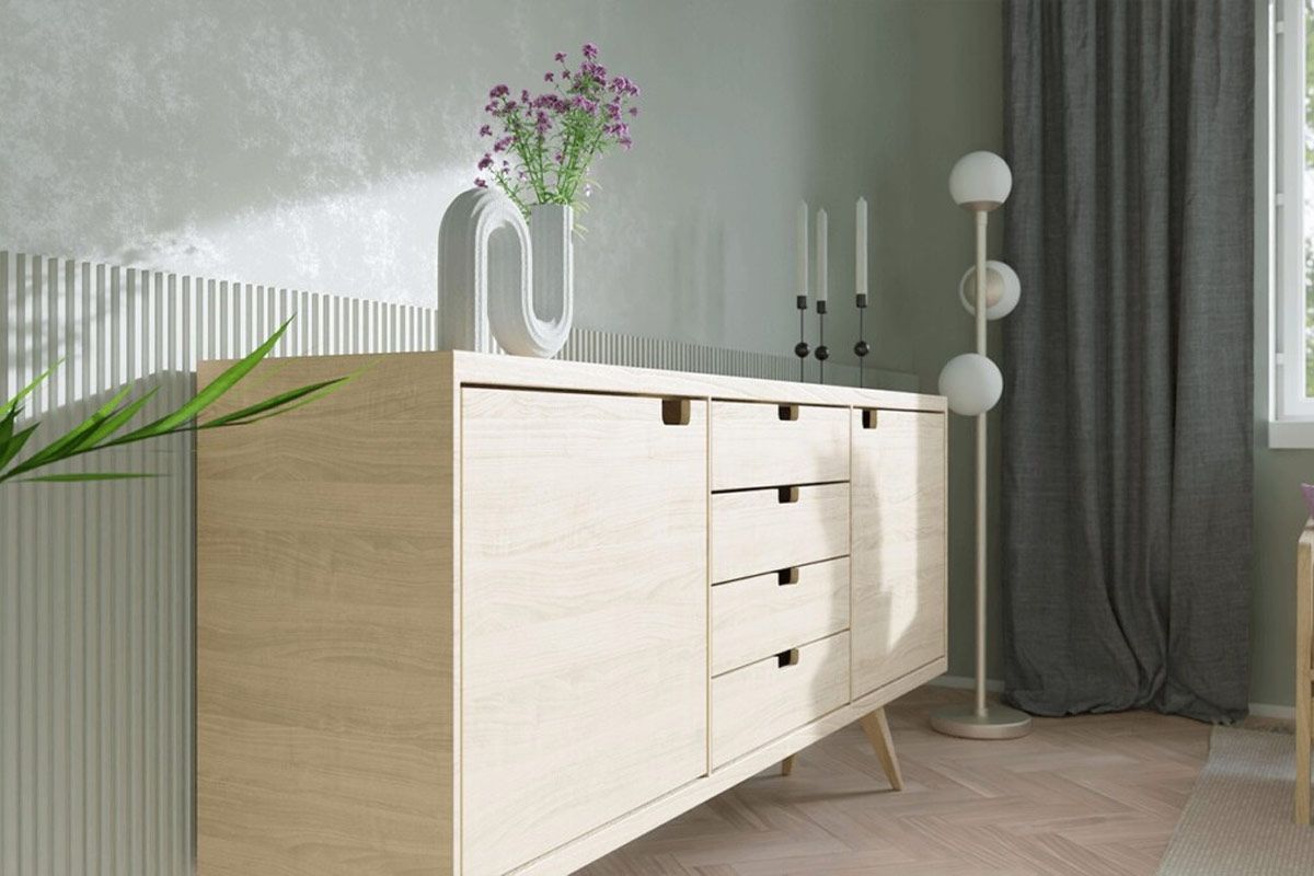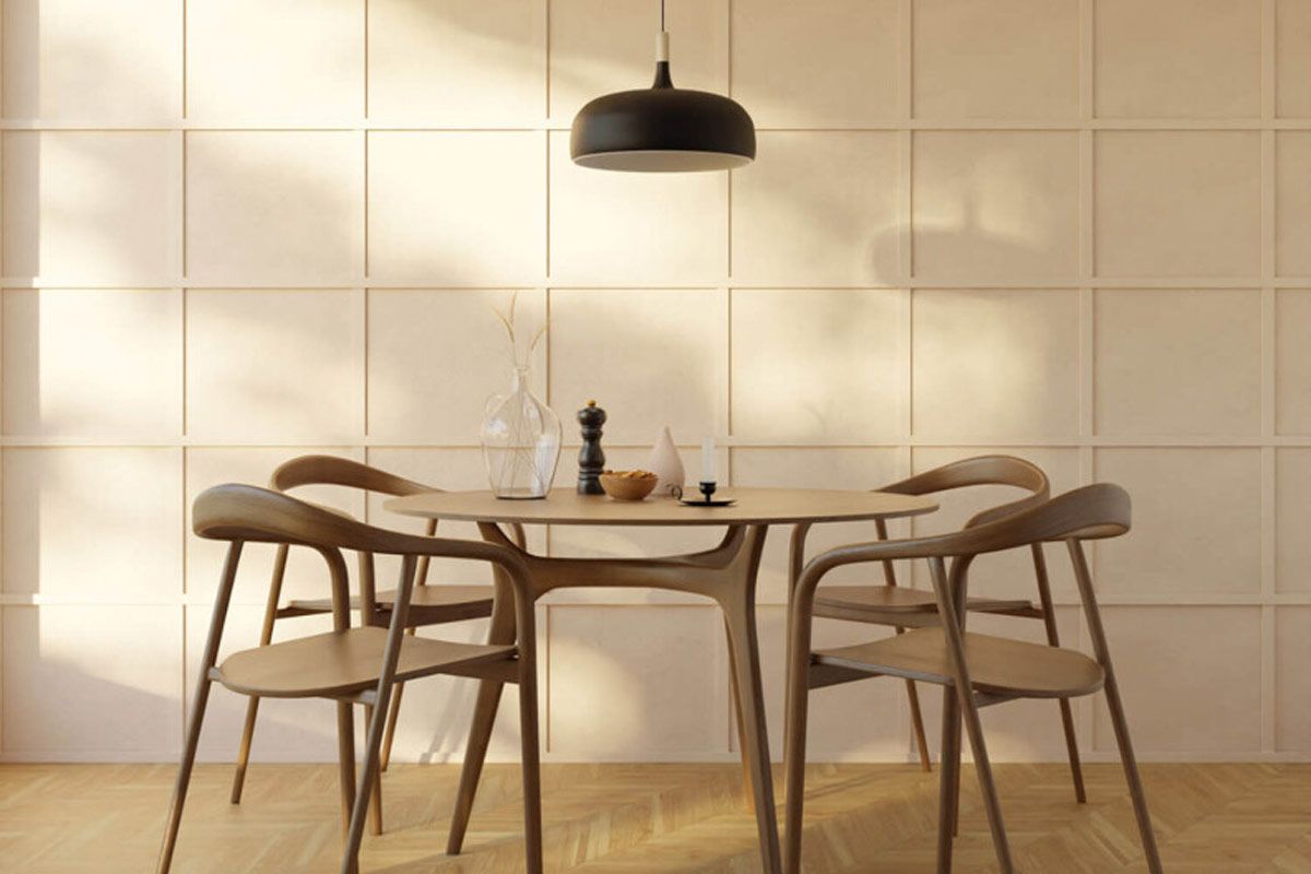 Suosiossa olevaan Japandi-sisustustyyliin sopii ruudukkolistoitettu seinä, Seinä ja listat maalataan samalla rauhallisella vaalealla sävyllä.