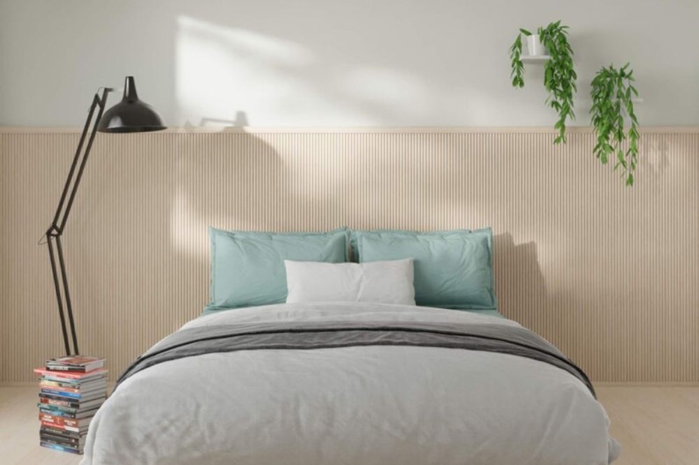 Puolipaneloinnilla voidaan tehdä myös mielenkiintoinen sängynpääty joko niin, että panelointi on pelkästään sängyn kohdalla tai seinästä seinään. Kun paneloinnin päälle laitetaan vielä leveämpi reunalista, saadaan samalla laskutilaa.