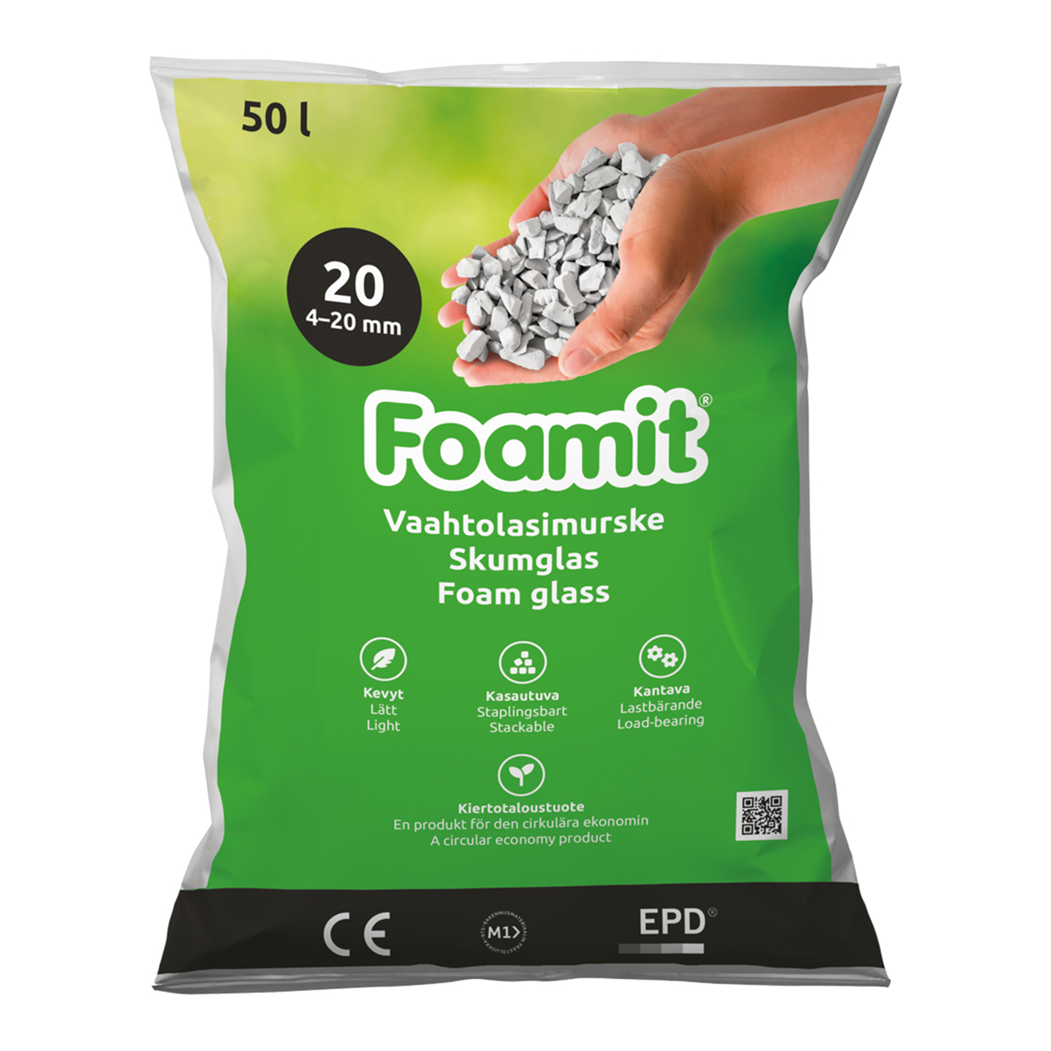 Foamit on 100 % kierrätetyistä materiaaleista valmistettu ja uusiokäyttöinen rakennusmateriaali. Sen karkeus ja kulmikas muoto mahdollistavat tarkkojen kaltevien pintojen rakentamisen sekä tiivistämisen kantavaksi rakenteeksi. Foamit ei upota edes tiivistämättömänä. Sitä voidaan käyttää kapillaarikatkona ja sopivissa kohteissa myös lämpöä eristävänä kerroksena. Luokassaan kevyimpänä materiaalina Foamitilla on lisäksi pieni hiilijalanjälki.